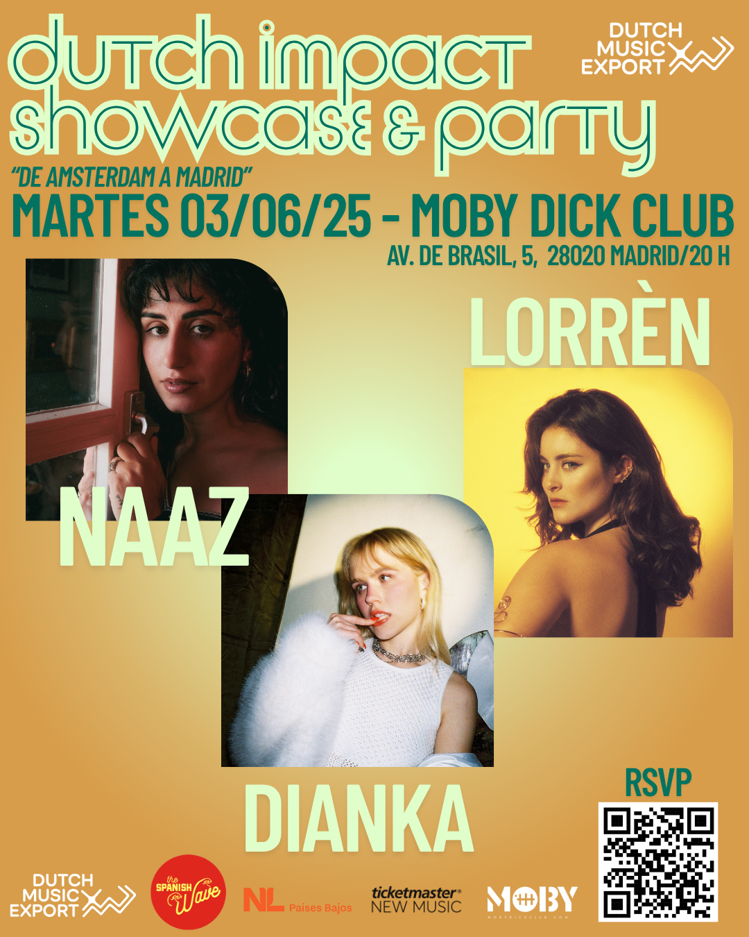 Este evento contará con las actuaciones de las artistas neerlandesas LORRÈN, cantautora que fusiona el soul clásico con el pop moderno y NAAZ la multidisciplinar artista de pop con influencias tradicionales de la música kurda combinando sonidos actuales y de raíz. A ellas dos se une la artista catalana afincada en Madrid DIANKA, que combina el folclore de los años 60 y 70 con la electrónica convirtiendo sus conciertos en una fiesta.