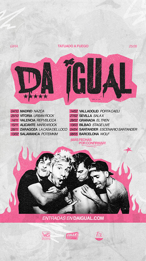 «Tatuado a Fuego» es el nuevo disco de DA IGUAL. 14 nuevas canciones de su clásico pop-punk del que destacan como single “No Volveré a Caer”. Una mezcla poco común entre el Trap y el desgarro Punk/Grunge de los 90′ con un sonido impactante y actual.